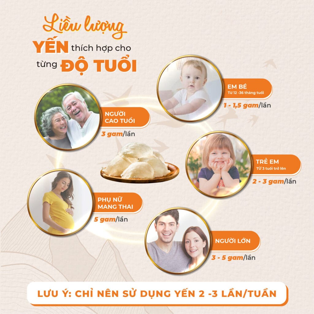 • Liều dùng khuyến nghị: 3–5 gram mỗi lần. Một tổ yến tinh chế 10 gram có thể chia làm 2–3 lần ăn tùy vào nhu cầu.