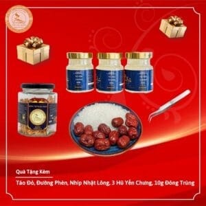 - Quà tặng kèm: Táo Đỏ, Đường Phèn, Nhíp Nhặt Lông, 3 Hũ Yến Chưng Sẵn, 10g Đông Trùng (áp dụng cho 100gr)